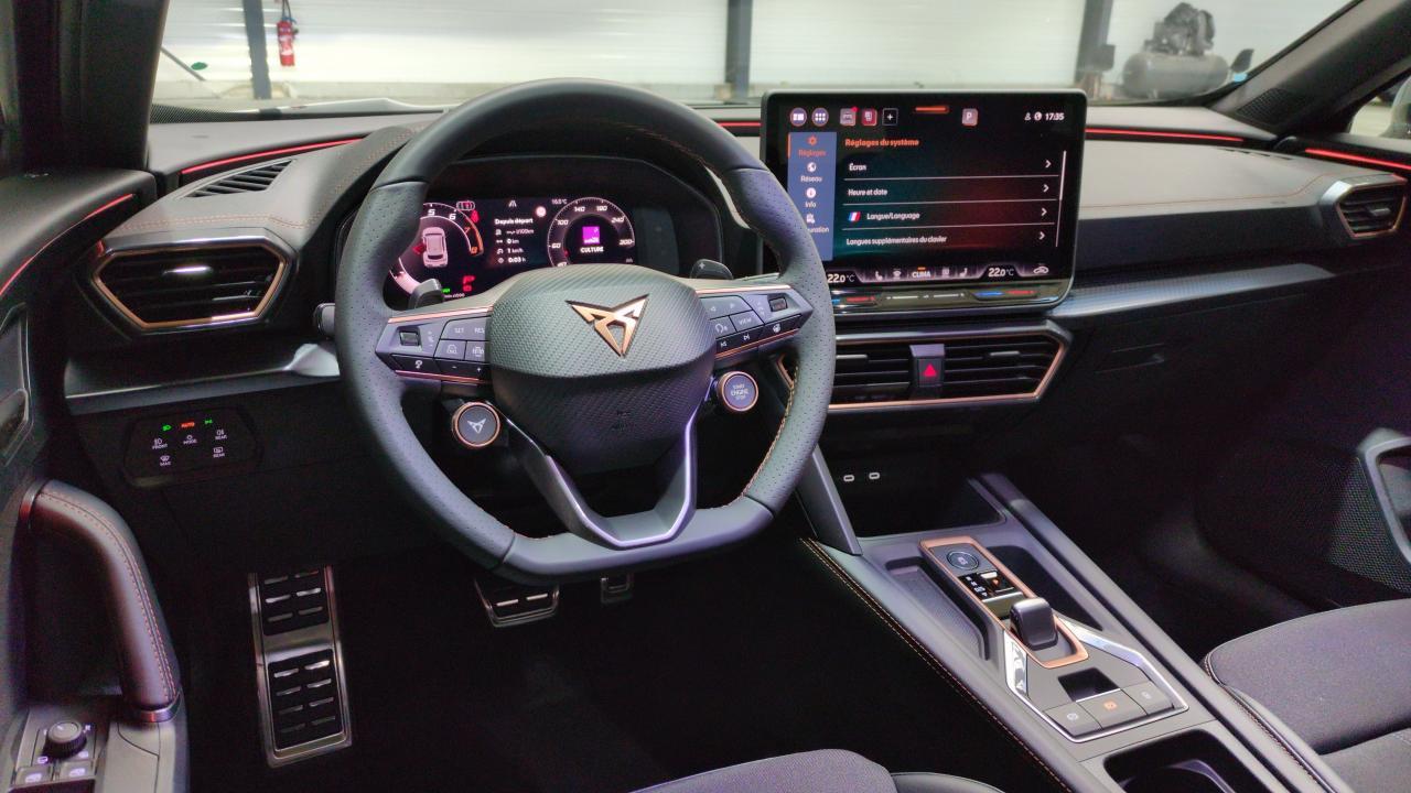 ABS - Accoudoir central AV réglable en hauteur et profondeur - Accès et démarrage mains-libres - Aide au maintien dans la voie (Lane Assist) - Aide au stationnement AV et AR - Airbags latéreaux - rideaux et central - Alarme antivol - Assistant d'intersection (Cross Traffic Assist) - Bandeau AR ''Infinite Light'' intégrant le logo CUPRA lumineux avec signature lumineuse Tri-LED et cérémonie de bienvenue - Boîte de vitesse séquentielle - CUPRA Box - CUPRA Connect - Caméra de recul - Capteur de pluie et de luminosité - Ciel de pavillon Noir - Climatisation automatique tri-zone "Climatronic" - Connectivity Box - Amplification du signal et chargeur à induction - Connectivité 4x USB-C et Bluetooth - Contrôle de la traction (TCS) - Contrôle électronique de la trajectoire - Couleur contrastante Noir Obsidien (bas de caisses - entrées d'air AV - diffuseur - élargisseurs d'ailes et coques de rétroviseurs) - Design intérieur Pure - Sièges sports bimatière textile et TEP Noir Asphalte - Planche de bord noire surpiquée avec inserts Dark Alu - Contre-portes en TEP noir surpiqués - Sièges conducteur et passager avec réglage manuel en hauteur et lombaire - Digital Cockpit 10 - 25'' - Direction dynamique - Dossiers AR rabattables 2/3 - 1/3 et trappe à skis - Double sortie d'échappement Noire stylisée - Détection de fatigue et somnolence - Eclairage de bienvenue avec projection du logo CUPRA au sol et éclairage d'accompagnement - Entourage de vitres et rails de toit Noir Piano - Extension de garantie 3 ans / 100 000 km - Feux de route intelligents (Light Assist) - Fixations ISOFIX avec Top-Tether à l'AR - Front Assist avec détection des piétons et des cyclistes - Full Link sans fil ( Android Auto + Apple CarPlay) - Hayon électrique mains-libres ''Virtual Pedal'' - Jantes alliage 18" Tempest - Kit de sécurité CUPRA - Lampes de lecture LED à l'AV et à l'AR - Lane Assist Plus - Pack Intérieur Dark Alu avec inserts cuivrés - Pare-soleils avec miroirs de courtoisie éclairés - Peinture métallisée Noir Minuit - Projecteurs anti-brouillard triangulaires avec éclairage d'intersection - Projecteurs full LED avec signature lumineuseTri-LED - Pré-installation pour attelage - Radio numérique DAB - Régulateur de vitesse adaptatif ACC - Rétroviseur intérieur électrochrome - Rétroviseurs extérieurs électriques - dégivrants - et rabbattales électriquement - Seuils de porte CUPRA rétro-éclairés - Sièges avant chauffants - Sign Assist - reconnaissance des panneaux de signalisation - Smart Ambient Light (éclairage d'ambiance intérieur intelligent) - Système audio à 6 HP avec contrôle vocal - Système d'info-divertissement avec écran tactile HD 12 - 9'' et touches de commandes tactiles rétro-éclairées - Système de contrôle de la pression des pneus - Verrouillage centralisée - Vitres AR surteintées - Vitres électriques AV - Volant Supersports CUPRA en cuir avec boutons satellites - chauffant avec palettes de changement de rapport - eCall - appel d'urgence - - - Transport possible.