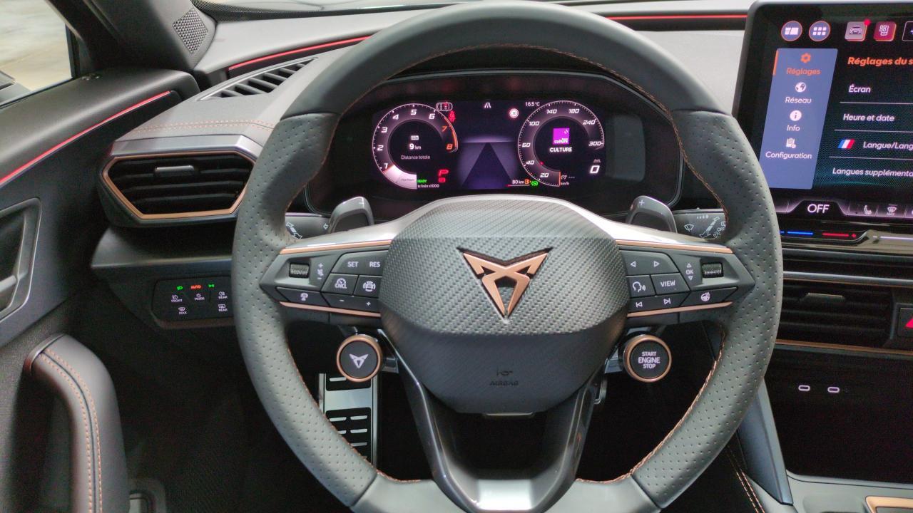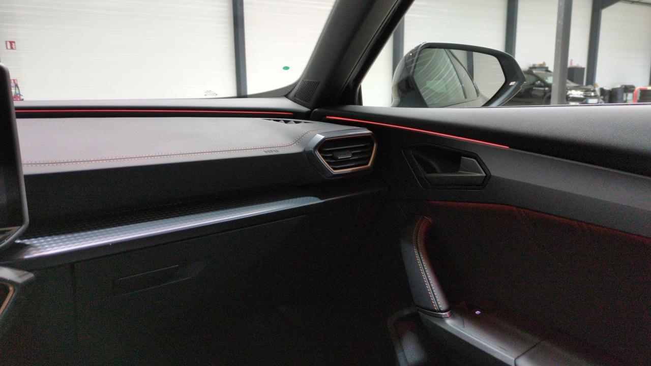 ABS - Accoudoir central AV réglable en hauteur et profondeur - Accès et démarrage mains-libres - Aide au maintien dans la voie (Lane Assist) - Aide au stationnement AV/AR - Airbags latéraux - rideaux et central - Alarme antivol - Assistant d'intersection (Cross Traffic Assist) - Bandeau AR ''Infinite Light'' intégrant le logo CUPRA lumineux - avec signature lumineuse Tri-LED et cérémonie de bienvenue - Boîte de vitesse séquentielle - CUPRA Connect - Caméra de recul - Capteur de pluie et de luminosité - Ciel de pavillon Noir - Climatisation automatique tri-zone "Climatronic" - Connectivity Box - Amplification du signal et chargeur à induction - Connectivité 4x USB-C et Bluetooth - Contrôle de la traction (TCS) - Couleur contrastante Noir Obsidien (bas de caisses - entrées d'air AV - diffuseur - élargisseurs d'ailes et coques de rétroviseurs) - Design intérieur Pure - Sièges sports bimatière textile et TEP Noir Asphalte - Planche de bord noire surpiquée avec inserts Dark Alu - Contre-portes en TEP noir surpiqués - Sièges conducteur et passager avec réglage manuel en hauteur et lombaire - Digital Cockpit 10 - 25" - Direction dynamique - Dossiers AR rabattables 2/3 - 1/3 et trappe à skis - Double sortie d'échappement Noire stylisée - Détection de fatigue et somnolence - Eclairage de bienvenue avec projection du logo CUPRA au sol et éclairage d'accompagnement - Entourage de vitres et rails de toit Noir Piano - Extension de garantie 3 ans / 100 000 km - Feux de route intelligents (Light Assist) - Fixations ISOFIX avec Top-Tether à l'AR - Front Assist avec détection des piétons et des cyclistes - Full Link sans fil ( Android Auto + Apple CarPlay) - Hayon électrique mains-libres ''Virtual Pedal'' - Jantes alliage 18" Tempest - Kit de sécurité CUPRA - Lampes de lecture LED à l'AV et à l'AR - Lane Assist Plus - Pack Intérieur Dark Alu avec inserts cuivrés - Pare-soleils avec miroirs de courtoisie éclairés - Peinture métallisée Gris Magnétique - Projecteurs anti-brouillard triangulaires avec éclairage d'intersection - Projecteurs full LED avec signature lumineuseTri-LED - Radio numérique DAB - Régulateur de vitesse adaptatif ACC - Rétroviseur intérieur électrochrome - Seuils de porte CUPRA rétro-éclairés - Sièges AV chauffants - Sign Assist - reconnaissance des panneaux de signalisation - Smart Ambient Light (éclairage d'ambiance intérieur intelligent) - Système audio à 6 HP avec contrôle vocal - Système d'info-divertissement avec écran tactile HD 12 - 9" et touches de commandes tactiles rétro- éclairées - Système de contrôle de la pression des pneus - Verrouillage centralisée - Vitres AR surteintées - Vitres électriques AV - Volant Supersports CUPRA en cuir avec boutons satellites - chauffant - avec palettes de changement de rapport - - - Transport possible.
