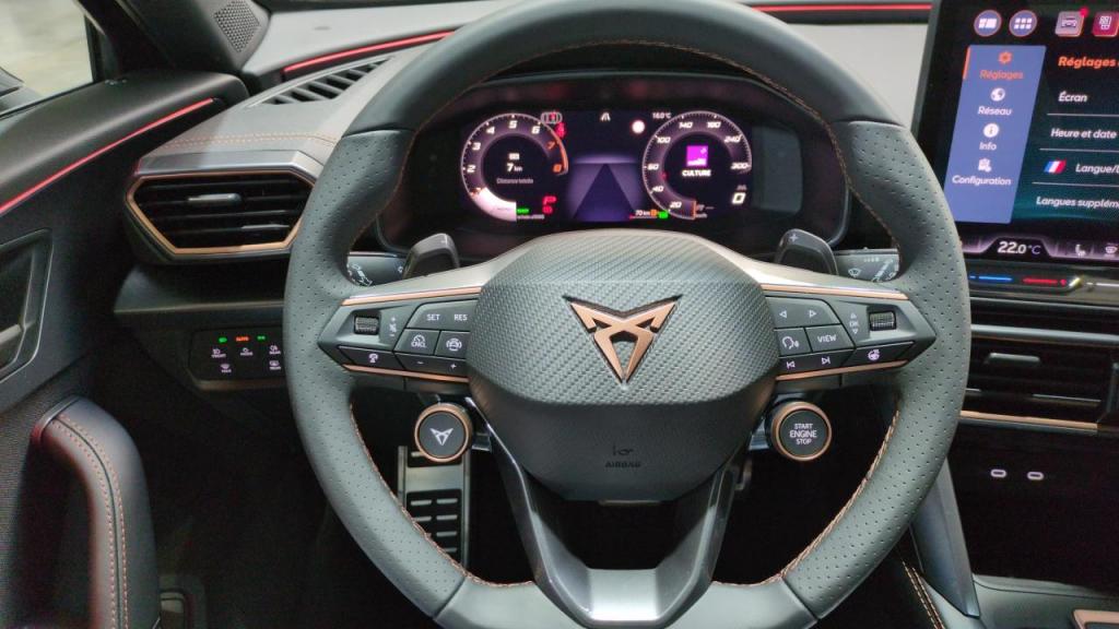ABS - Accoudoir central AV réglable en hauteur et profondeur - Accès et démarrage mains-libres - Aide au maintien dans la voie (Lane Assist) - Aide au stationnement AV et AR - Airbags latéreaux - rideaux et central - Alarme antivol - Assistant d'intersection (Cross Traffic Assist) - Bandeau AR ''Infinite Light'' intégrant le logo CUPRA lumineux avec signature lumineuse Tri-LED et cérémonie de bienvenue - Boîte de vitesse séquentielle - CUPRA Box - CUPRA Connect - Caméra de recul - Capteur de pluie et de luminosité - Ciel de pavillon Noir - Climatisation automatique tri-zone "Climatronic" - Connectivity Box - Amplification du signal et chargeur à induction - Connectivité 4x USB-C et Bluetooth - Contrôle de la traction (TCS) - Contrôle électronique de la trajectoire - Couleur contrastante Noir Obsidien (bas de caisses - entrées d'air AV - diffuseur - élargisseurs d'ailes et coques de rétroviseurs) - Design intérieur Pure - Sièges sports bimatière textile et TEP Noir Asphalte - Planche de bord noire surpiquée avec inserts Dark Alu - Contre-portes en TEP noir surpiqués - Sièges conducteur et passager avec réglage manuel en hauteur et lombaire - Digital Cockpit 10 - 25'' - Direction dynamique - Dossiers AR rabattables 2/3 - 1/3 et trappe à skis - Double sortie d'échappement Noire stylisée - Détection de fatigue et somnolence - Eclairage de bienvenue avec projection du logo CUPRA au sol et éclairage d'accompagnement - Entourage de vitres et rails de toit Noir Piano - Extension de garantie 3 ans / 100 000 km - Feux de route intelligents (Light Assist) - Fixations ISOFIX avec Top-Tether à l'AR - Front Assist avec détection des piétons et des cyclistes - Full Link sans fil ( Android Auto + Apple CarPlay) - Hayon électrique mains-libres ''Virtual Pedal'' - Jantes alliage 18" Tempest - Kit de sécurité CUPRA - Lampes de lecture LED à l'AV et à l'AR - Lane Assist Plus - Pack Intérieur Dark Alu avec inserts cuivrés - Pare-soleils avec miroirs de courtoisie éclairés - Peinture métallisée Noir Minuit - Projecteurs anti-brouillard triangulaires avec éclairage d'intersection - Projecteurs full LED avec signature lumineuseTri-LED - Pré-installation pour attelage - Radio numérique DAB - Régulateur de vitesse adaptatif ACC - Rétroviseur intérieur électrochrome - Rétroviseurs extérieurs électriques - dégivrants - et rabbattales électriquement - Seuils de porte CUPRA rétro-éclairés - Sièges avant chauffants - Sign Assist - reconnaissance des panneaux de signalisation - Smart Ambient Light (éclairage d'ambiance intérieur intelligent) - Système audio à 6 HP avec contrôle vocal - Système d'info-divertissement avec écran tactile HD 12 - 9'' et touches de commandes tactiles rétro-éclairées - Système de contrôle de la pression des pneus - Verrouillage centralisée - Vitres AR surteintées - Vitres électriques AV - Volant Supersports CUPRA en cuir avec boutons satellites - chauffant avec palettes de changement de rapport - eCall - appel d'urgence - - - Transport possible.