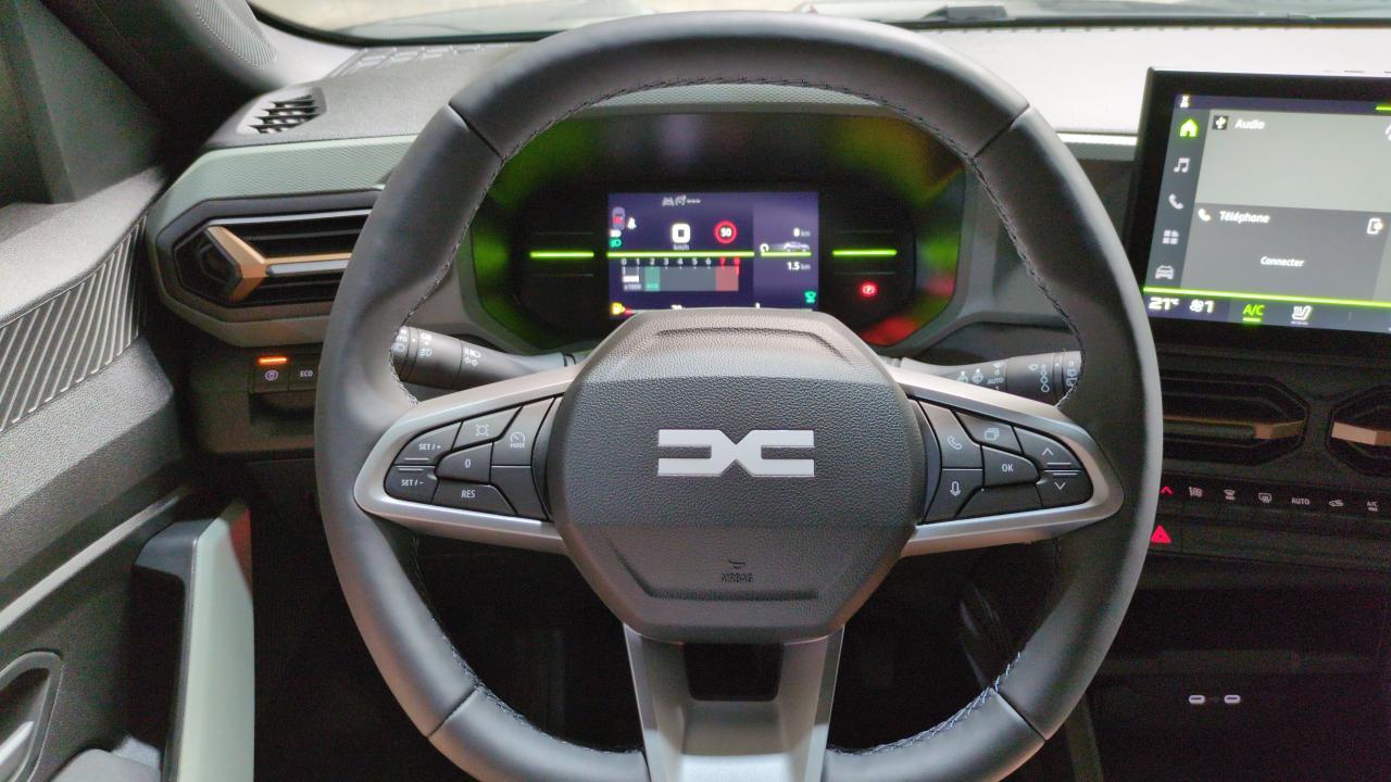 Airbag AV conducteur et passager - Airbag passager déconnectable - Airbags latéraux AV et rideaux - Alerte franchissement de ligne et assistant maintien dans la voie - Allumage des feux automatique et essuie-glace automatiques - Avertissement distance de sécurité - Banquette AR rabattable 40/60 - Barres de toit modulables - Boîte de vitesse manuelle - Boucliers ton carosserie - Climatisation automatique - Commutation automatique feux de croisement/route - Console centrale semi haute avec accoudoir - Contrôle de trajectoire en descente avancé - Coques de rétroviseurs Brun Cuivré - Détection de perte de pression des pneus - Direction assistée - ESP - Feux de croisement à LED - Jantes alliage semi-diamantées 17'' TERGAN - Kit de gonflage - Lève-vitres AR électriques - Lève-vitres AV électriques - Lunette AR dégivrante - Media Nav Live : Navigation avec trafic en temps réel + Système audio 3D Arkamys + 6HP - Mode éco - My Safety Switch (bouton de déconnexion des aides à la conduite) - Ouverture du hayon manuelle - Pack City : Caméra Multiview + Avertisseur d'angles morts + Radars AV-AR - Pack Cold : Sièges AV chauffants + Volant chauffant - Pack Techno : Frein de parking électrique + Recharge smartphone par induction + Media Nav Live : Navigation avec trafic en temps réel + Système audio 3D Arkamys + 6HP - Peinture métallisée Vert Cèdre - Prise 12V coffre - Projecteurs antibrouillard - Reconnaissance des panneaux de signalisation avec alerte de survitesse - Régulateur et limiteur de vitesse - Répétiteurs latéraux à LED - Rétroviseur intérieur jour/nuit - Rétroviseurs extérieurs électriques - dégivrants et rabattable automatiquement - Sellerie TEP "Microcloud"avec logo Dacia - Siège passager réglable en hauteur + lombaire conducteur - Signature lumineuse en "Y" à LED - Système anti-blocage des roues (ABS) - Système de contrôle de traction (TCS) - Système de fixation Isofix - Système de freinage d'urgence avancé (piéton - deux-roues et intersection) - Système de surveillance de l'attention du conducteur - Tableau de bord numérique 7" - Vitres AR surteintées - Volant réglable en hauteur et en profondeur - Volant Soft Feel - - - Transport possible.